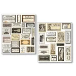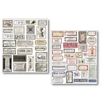A set of 10 assorted uncut transparent adhesive sheets featuring tags and labels with a vintage feel. The stickers are perfect for mixed media, collage, junk journal, scrapbooking and paper craft arts.